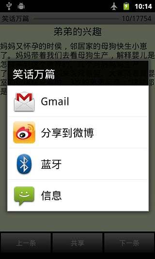 笑话万篇是一款可以离线阅读两万多篇笑说的手机应用,无需联网更新,自动定位到你上次看的地方,还可以分享在微博短信等地方哦。喜欢的朋友来下载试用吧