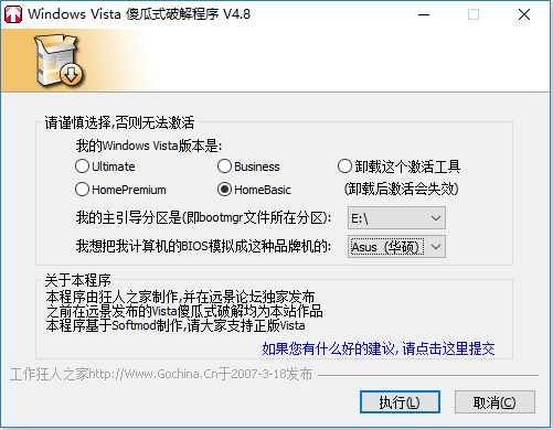 在vista下即右键点击此程序,选择“在管理员模式下运行”,按提示选择正确的版本后,点“执行”自动导入授权证书,自动更换序列号,自动安装softmod补丁,重启后即可进行激活。