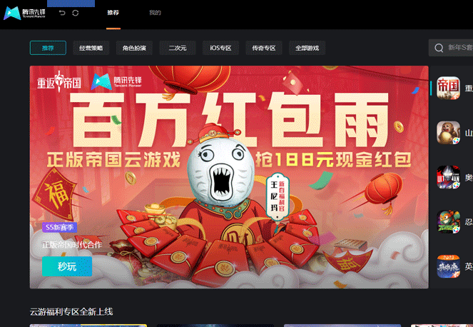 腾讯先锋是一款非常好用的云游戏平台软件,在这里你可以体验到各种经典热门的游戏在线云玩,不需要任何的下载和安装,免去了你的漫长等待时间,只需要点开就可以加载游戏进行游玩了。