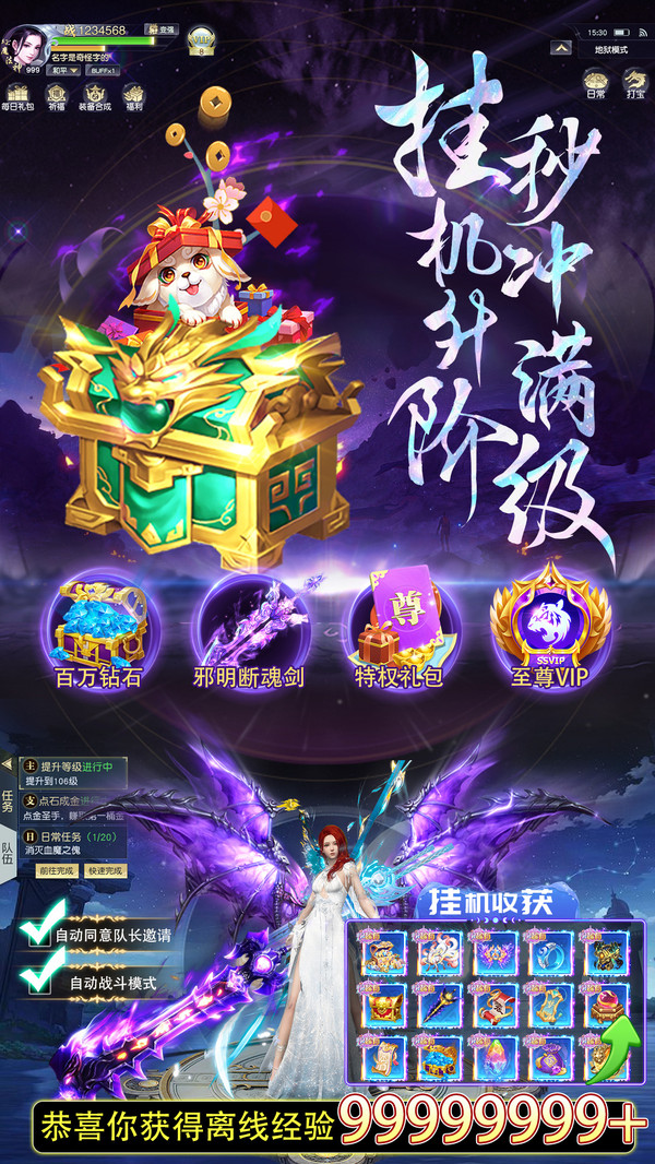 轻松放置的玩法,带来割草式升级的畅快体验。无需过多的投入,不肝不氪,轻松挂机也能让战力猛增,首日便可飞升至300级!一键操作,简洁灵活,无限连招引燃战斗热情,神力飞升令您畅快不已。