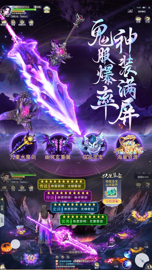 在仙域的战场上,百名仙侣同屏对战,千人共同舞动剑光,勇闯跨服Boss,争夺珍稀仙宝,直至为己所用,挥剑如龙,征战四方,尽享巅峰的战斗体验。