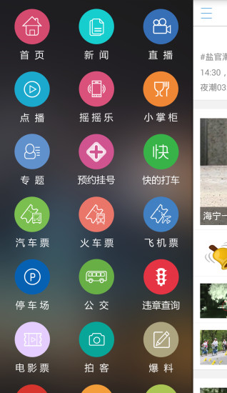 掌上海宁软件是一款手机新闻资讯软件,在该平台上用户可以阅读海宁市的实时资讯和新闻,了解地方趣事。还为用户提供了直播、预约挂号、违章查询、火车票等服务功能,让用户不用出门就能办理相关事务,为人们的生活提供了便利。感兴趣的朋友们快来下载体验吧!