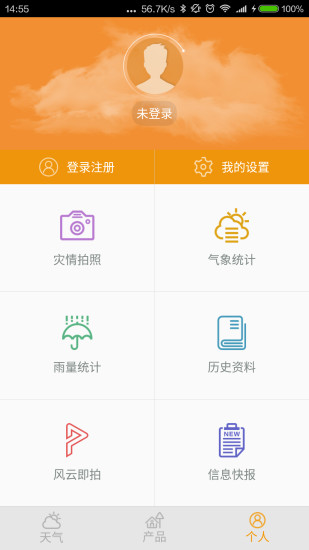 个人主页有灾情上传、中山地区气象统计、雨量统计、历史资料、信息快报等气象服务功能,部分功能为预报员使用的专用业务功能。