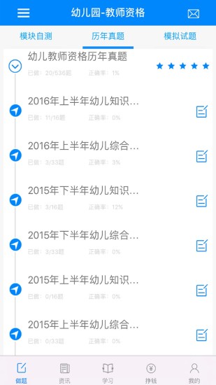 教师资格证考试题库app是一款最新的教师资格证试题大全,也是根据国家最新的考试大纲制作,包含了中小幼三阶段的试题,非常的全面,而且还有历年真题在线学习,用户还可以模拟考试,是备战教师资格证考试的必备软件,欢迎大家来下载试用使用。
