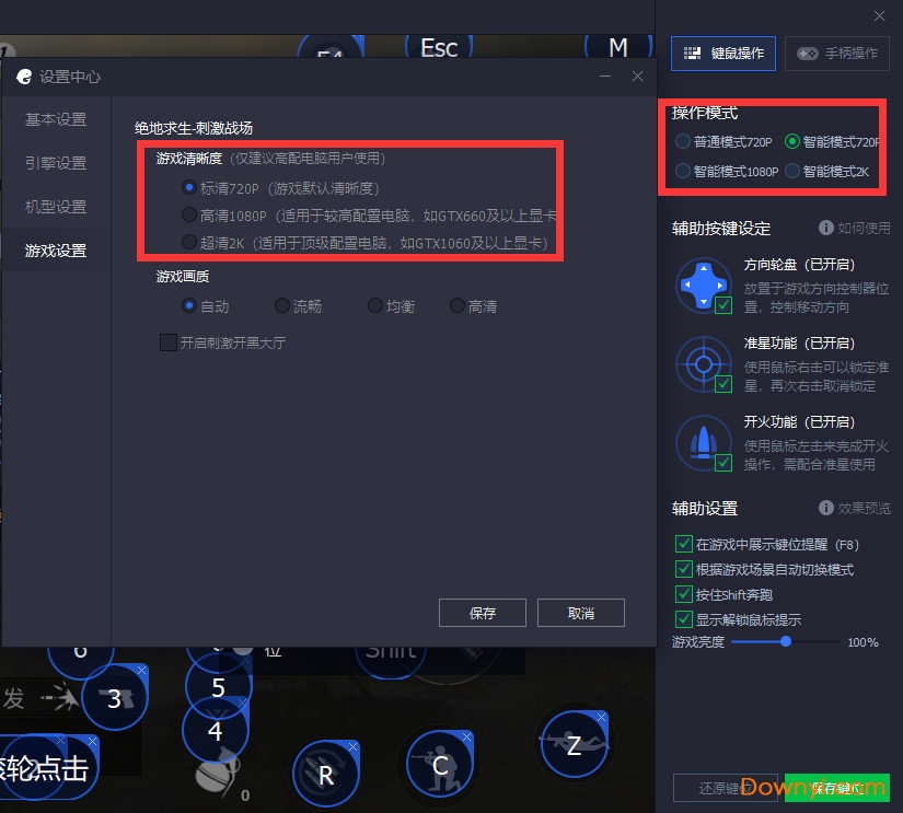 6.键位设置中的操作模式要和游戏中的清晰度完全匹配.(比如选择标清720p,操作模式就选择智能模式720p)