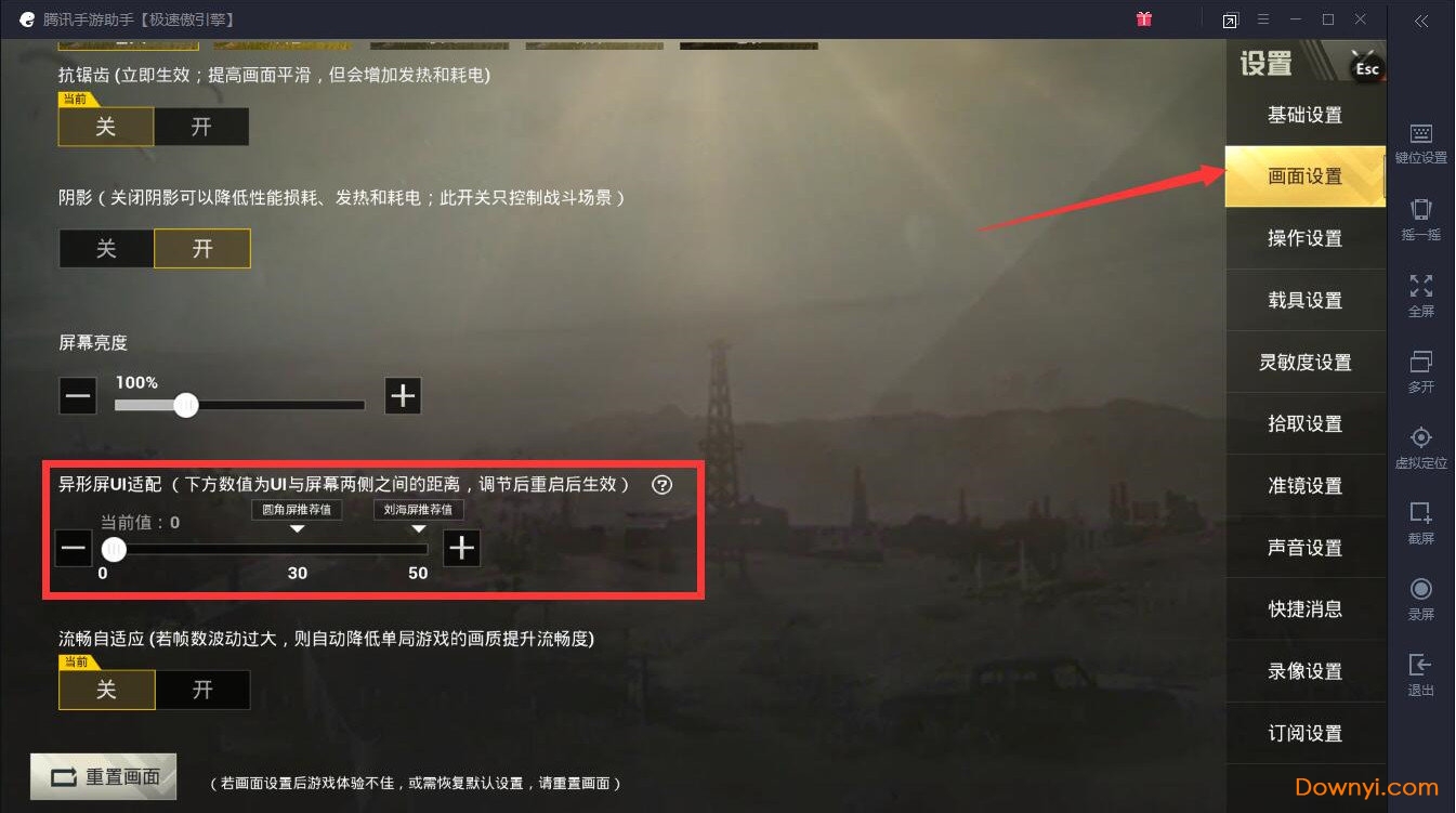 8.点击【画面设置】拉到下面把【异形屏ui适配】拉到0