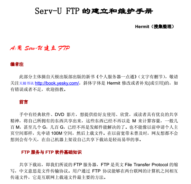 serv-u ftp的建立和维护手册旨在帮助我们更好的搭建和建立serv-u ftp,里面详细的介绍了相关的细节以及建立的具体过程,有需要的小伙伴们千万不能错过,快来加入吧。详情请上当易网了解更多。
