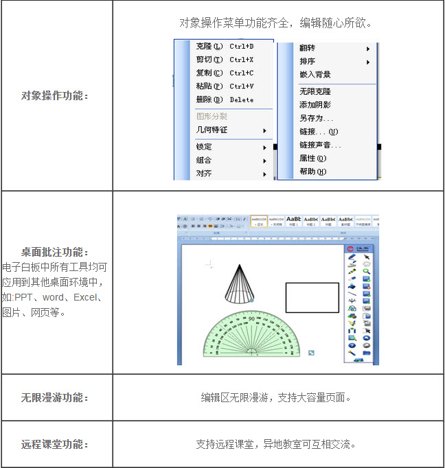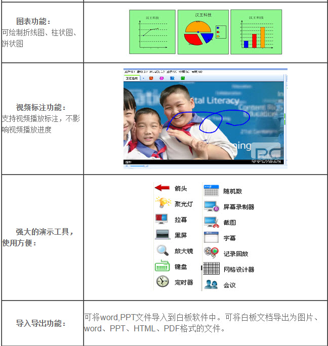汉王电子白板软件专门为演讲者定制的制作和演示课件的软件。该软件提供了各种书写标记工具、可插入编辑文本、图片、视频、动画等素材,并且可是设置页面动画和对象动画。除此之外,还提供了多种仿真教学工具,比如:聚光灯、拉幕、计时器等,方便教师使用。