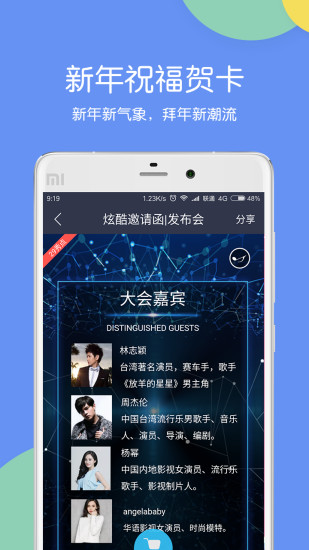 易企秀提供海量精美模板助您完成移动端企业宣传与个人秀。新年贺卡 ,微信拜年,微招聘,微店买卖,婚礼请柬,邀请函,微海报,banner图,微信请柬,请帖,音乐相册,节日贺卡,个人简历,应有尽有,总有一款适合您。