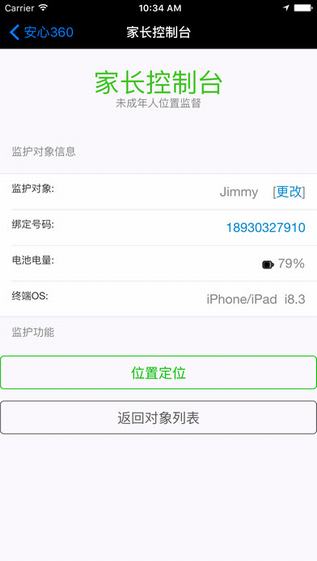 3.家长返回自己的手机上并进入本软件后,点击[家长模式控制],进入监护列表即可选择孩子的手机对象,进入查看实时连续位置;