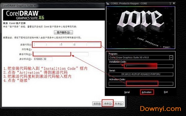 1.把安装代码输入到“installtion code”框内2.点击“activation”得到激活代码3.把激活代码复制到激活代码输入框内4.点击“继续”按钮。