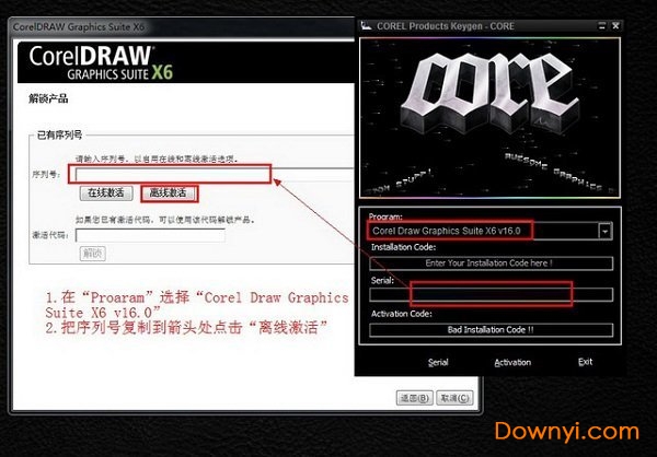 在“proaram”处选择“coreldraw graphics suite x6 v16.0”-然后把激活码获取工具里面的序列号复制到图中箭头处,点击“离线激活”。