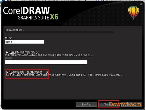 勾选“我没有序列号,我想试用产品”然后点击“下一步”按钮。