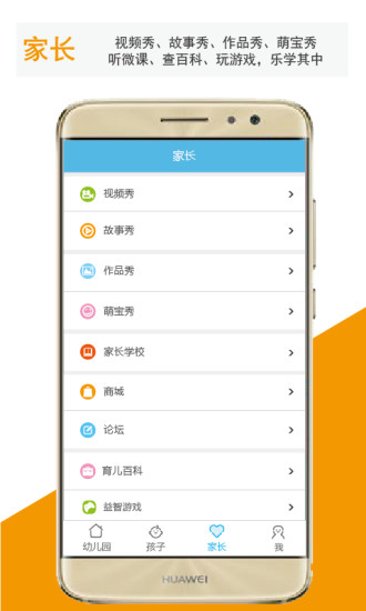【家长】:视频秀、听微课、逛商城、泡论坛、学知识、玩游戏,让孩子、家长都能乐学其中。