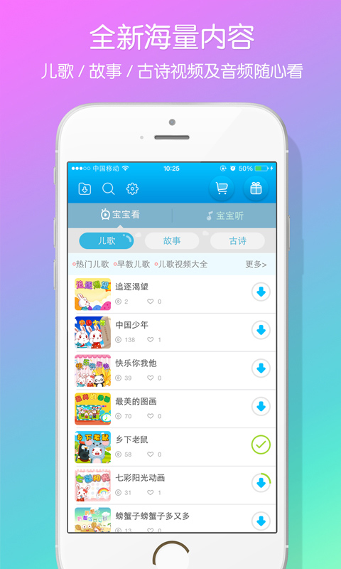 《早教儿歌》《摇篮曲》《少儿歌曲》《幼儿园儿歌》《节日儿歌》《英文儿歌》《校园歌曲》《童年歌曲》等系列,并与多名儿童小歌手签约,优先获取最新发布的儿歌.《童话故事》《睡前故事》《成语故事》《绘本故事》《一千零一夜》《格林童话》让宝宝在充满生动有趣的动画中,启迪智慧,养成良好的习惯.