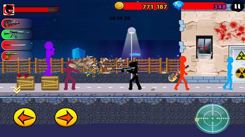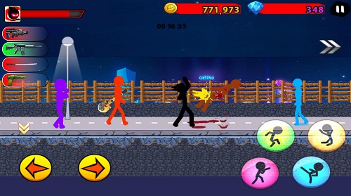 家要控制火柴人不断的跳跃躲避敌人的子弹,然后通过强大的活力压制敌人,游戏采用比较常见的虚拟摇杆控制,左边是方向按钮,右边是攻击以及跳跃按钮,游戏中可以购买各种武器,然后通过不断的杀敌来赚取金钱再进行升级。