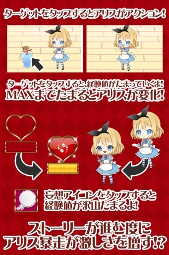 点击地面上的物体给爱丽丝就会增加妄想值,爱丽丝的模样会随着妄想值的增加而变化,变化后的模样会自动登录到图鉴上。如果把图鉴分享到sns上的话,就会进入获得大量妄想值的奖励时间哦。