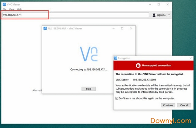 1、首先在本页面下载最新版本的vnc viewer,安装完成后并运行,在vncserver一栏输入【192.168.203.47:1】