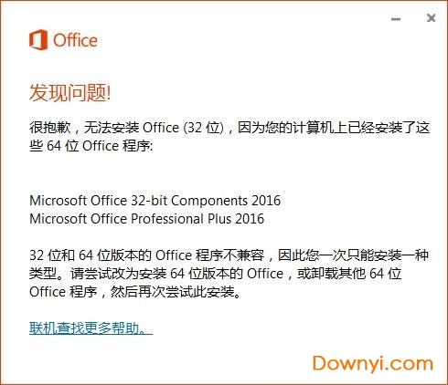 安装office2016之前我们先要卸载其他office产品,为此我们需要使用office卸载工具进行卸载,否则会导致无法安装office2016,并且会有以下提示: