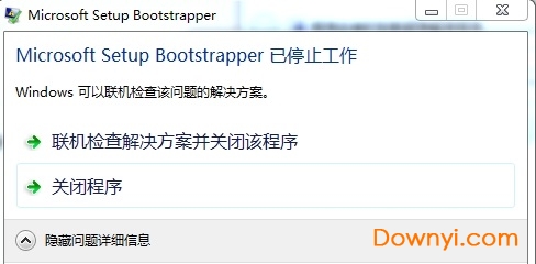 其次,安装过程中如果提示“microsoft setup bootstrapper 已停止工作”(如图),请重启电脑再进行安装。