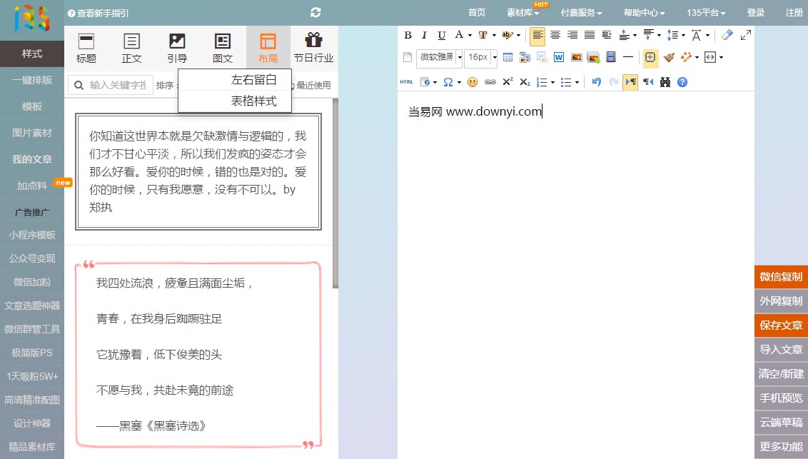 135编辑器是一个微信文章美化工具,操作简单方便,旨在提供丰富的样式,精美的模板。编辑文章时,就像拼积木一样,挑选样式,调整文字,搭配颜色,最后形成排版优质的文章,让读者更赏心悦目。