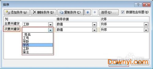 4、根据自己需要的排序方式进行设置。本例中,选择的“主要关键字”是“工龄”,“次要关键字”是“学历”,设置完成,点击“确定”。