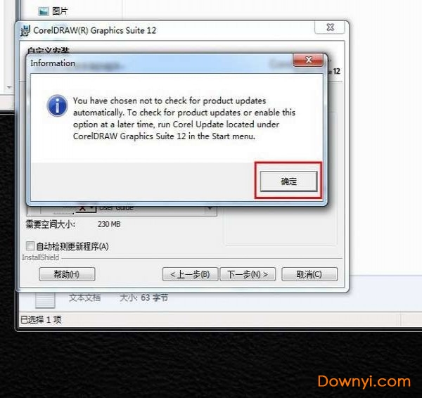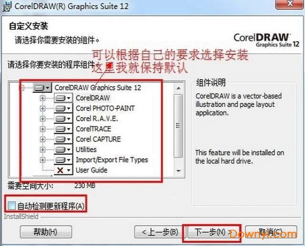 第五步:CorelDraw12【Cdr12】安装类型CorelDraw12【Cdr12】自带的插件(附件)根据自己的要求选择,这里我就保持默认即可。取消勾选“自动检测更新程序”然后点击“下一步”。