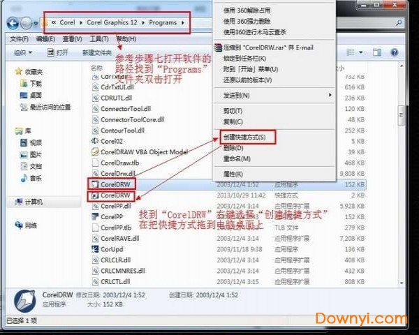 第十步:找到软件的安装路径找到CorelDraw12【Cdr12】的安装路径(步骤七)打开“Programs”文件夹--创建CorelDraw12【Cdr12】快捷方式拖到桌面上。