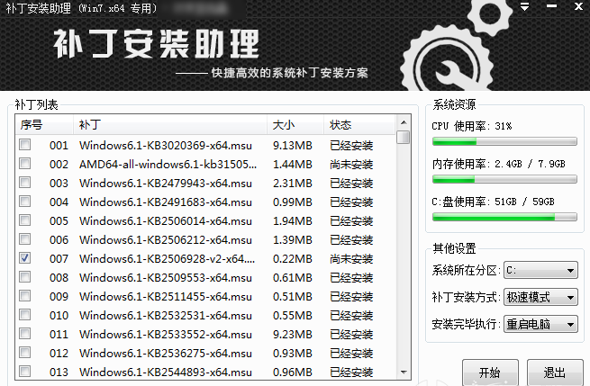 2、优化Win7补丁安装机制,补丁安装速度比一般软件提高两倍以上;