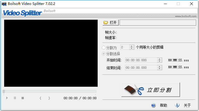 已经做成绿色便携版,直接运行 BoilsoftVideoSplitterPortable.exe 即可,操作起来非常简便,2013/4/6 更新版本为 Boilsoft Video Splitter 7.02.2,提供英文绿色版和中文绿色版(感谢 窗外有蓝天 提供汉化补丁),汉化若无法处理中文字符,可尝试重命名视频文件再切割。