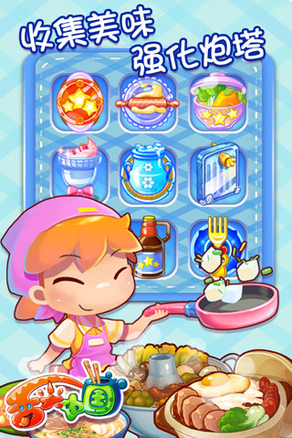 《舌尖中国塔防》是一款以美食为题材的策略塔防手游。游戏结合了农场和塔防,开辟了塔防新玩法。在传统塔防打怪获得金币的基础上,玩家还可以通过种菜收菜来获得金币。收集的食材可以炒菜,炒菜可以升级吃货、解锁和强化炮塔。清新可爱的画面,秀色可餐的场景,q版的怪物和表情,欢快的音乐,是吃货们的最爱!