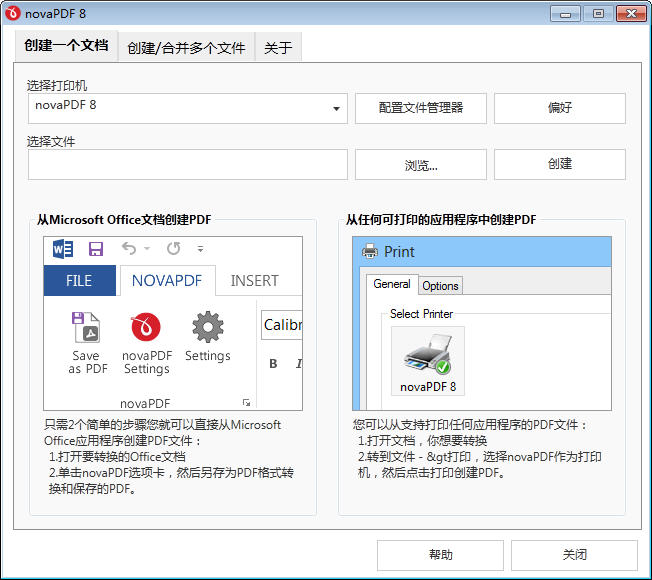 理论上NovaPDF可以把任何格式的文件转换成PDF格式,只要那个文件可以打印就行,因为这个软件与其他同类软件不同,它会把自己“伪装”成一台打印机,只要你打开一 个文件,选择“打印”菜单,选择“novaPDF”打印机就可以把文件制作成pdf了。所以使用这个pdf转换软件就不用担心格式支不支持的问题了。