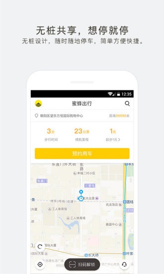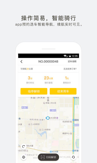 扫码开锁,关锁自动计费,app预约选车,智能导航,续航实时可见。