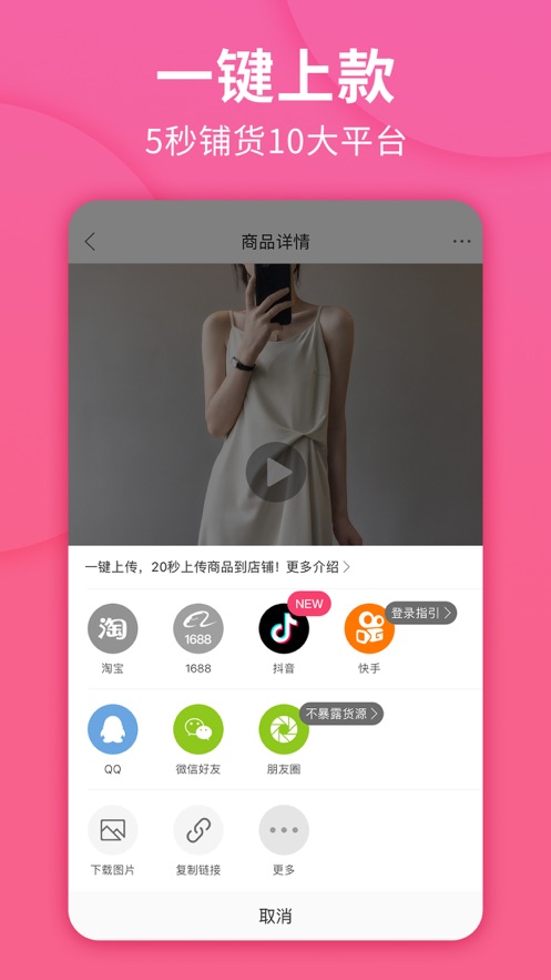 只要你看中,就能上架卖。商品图、视频及商品详情信息都能一键上传到淘宝、天猫、1688、蘑菇街、拼多多、微信、抖音、快手等平台。再也不用自己到处找图抠图啦。