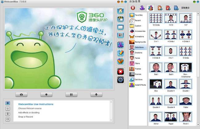 一款全中文的的网络视频聊天效果软件。为网络摄像头添加视频、屏幕、图片、Flash以及各种丰富多彩的魔幻效果,并且可以在所有即时消息软件上实时播放。而且即使你没有摄像头也同样可以使用。视频特效WebcamMax可以使用在各种摄像头软件上,比如MSN、qq、UC、Skype等等。它拥有各种各样的功能,比如画中画、双摄像头、播放列表、手绘、播放幻灯片以及换肤等功能。