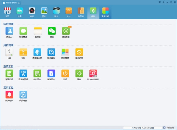 itools是一款专门为苹果用户设计的苹果设备管理软件,无需越狱即可同步,可对ios轻松管理。itools软件小巧,占用资源少,运行速度快,功能齐全,与同类软件相比体验更好。