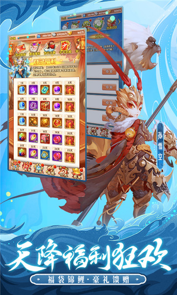新服登录累送100000元宝;首周超级神将:孙悟空、二郎神、牛魔王认你选!法宝定海神针、哮天犬、芭蕉扇7天即送……不花钱,照样玩出爽快!