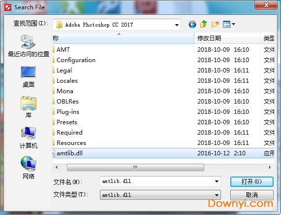 7、弹出窗口,直接进入软件的安装路径,默认路径为c:\program files\adobe\adobe photoshop cc 2017,然后找到“amtlib.dll”文件,点击打开