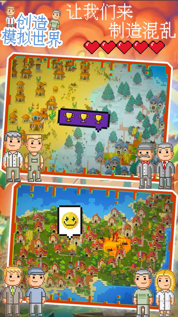 创造模拟世界游戏是在朋友圈非常火爆的沙盒建造玩法类手游,你们所有人都会成为这个像素世界中的上帝,可以自由创造任何事务,不管是人还是建筑。同时当大家不开心时,也能制造混乱来毁灭自己创建的人类家园哦!
