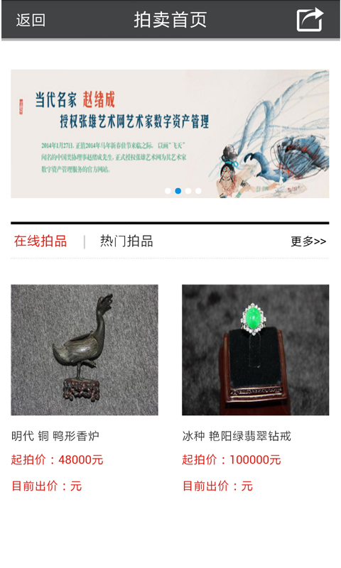张雄艺术手机版是一款艺术类手机应用,在这里你可以看到全球艺术资源,各种有关艺术的新闻实时播报,还有在线拍卖、名家鉴定等功能,让你对你的艺术品有充分的认知,快来体验吧!