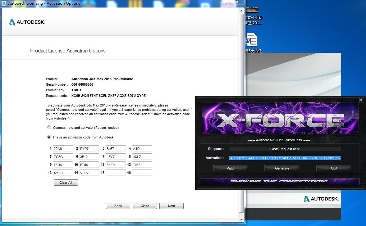 17、打开3dsmax2015注册机,粘贴得到的激活码到request框中,并点击“patch”弹出“Successfully patched”;