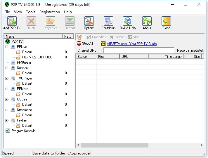 P2P TV Recorder是目前唯一能记录PPLive, PPStream, Coolstreaming, SopCast等各种P2P网络电视的工具, 能方便地保存各种P2P网络电视到你的硬盘,实现离线观看网络电视. 该工具也提供监视磁盘使用情况,保护你的硬盘。