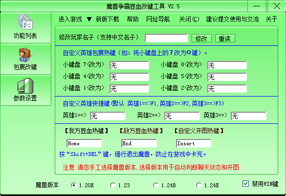 魔兽显血、自定义包裹热键和英雄热键、快速自动进入魔兽游戏、浩方平台、VS平台和QQ平台等。还可以修改玩家名字功能,支持修改中文名子。再也不用看着别人用炫酷的中文名字而自己不会而发愁了!