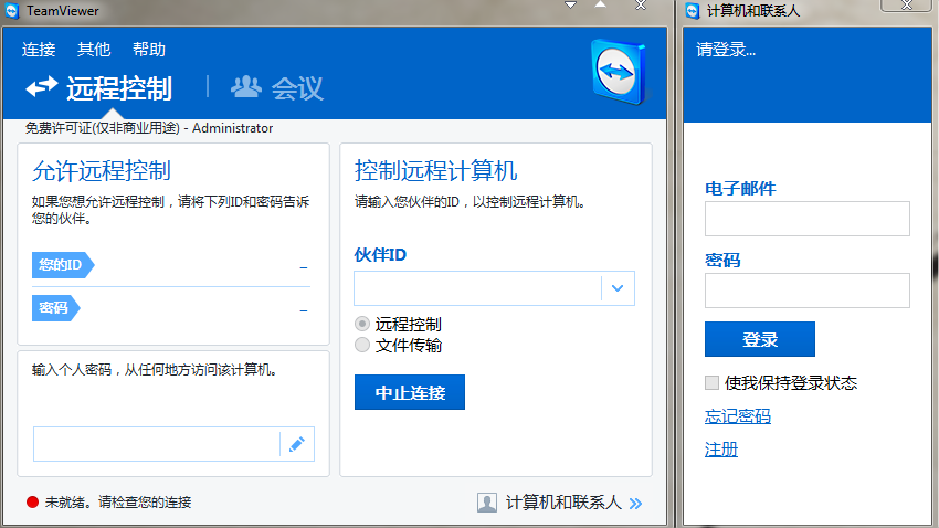 为了连接到另一台计算机,只需要在两台计算机上同时运行TeamViewer即可而不需要进行一个安装的过程。该软件第一次启动在两台计算机上自动生成伙伴ID。只需要输入你的伙伴的ID到TeamViewer,然后就会立即建立起连接。