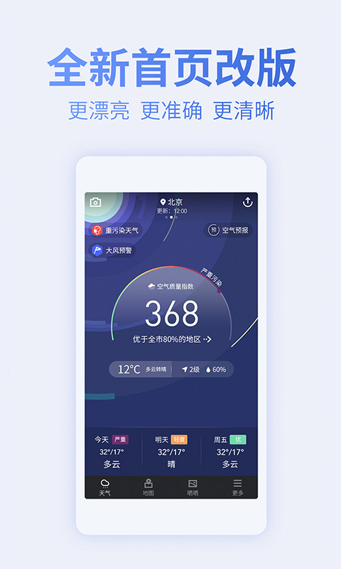 可看本市、全国空气污染动态。更有气象灾害和雾霾监测预警,让你对蓝天和雾霾了然于胸,不管阴晴风雨都保持淡定。