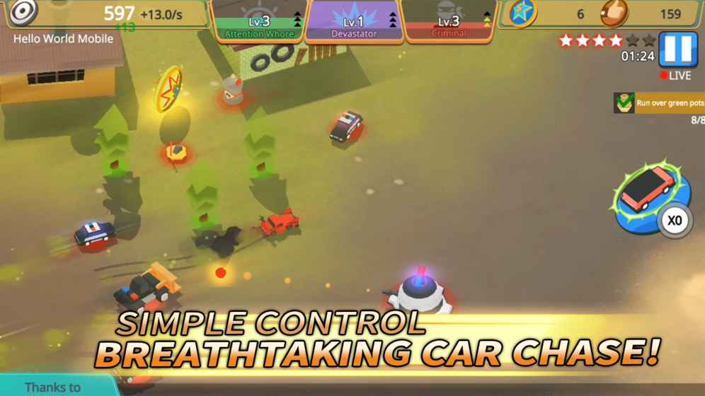 表演各种开车特技,摆脱来自警察的围追堵截!所有观众将不吝为你点赞!