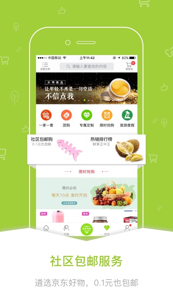 3、新增社区包邮服务,遴选京东好物,0.1元也包邮;