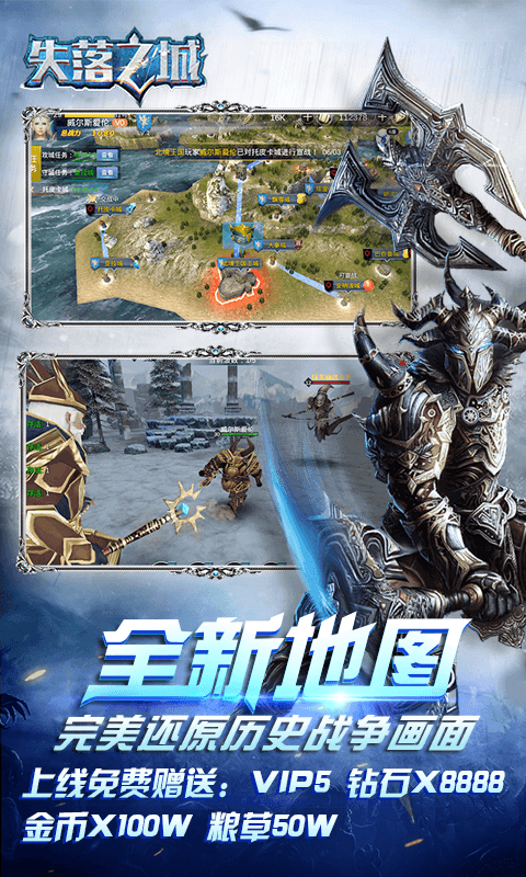 ★上线送VIP5、钻石*8888、金币*100W、粮草50W;