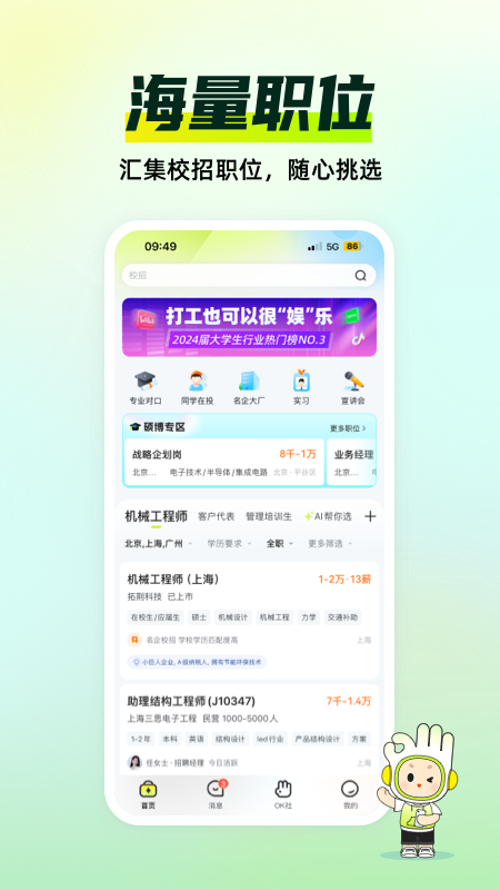 应届生求职app是一款专为大学应届毕业生及在校生设计的招聘求职服务应用。该软件提供了名企校园招聘信息的实时更新,准确、全面地帮助用户掌握校园招聘动态。此外,APP还集成了校园招聘、名企实习、宣讲会、招聘会信息、职业测评、求职资讯和就业辅导等丰富内容,使用户能够及时了解各种实习和招聘信息,参与校园宣讲活动,获取更多实用的求职知识和技巧。同时,贴心的订阅功能让用户可以一键关注心仪的企业,避免因消息延迟而错失好的工作机会。