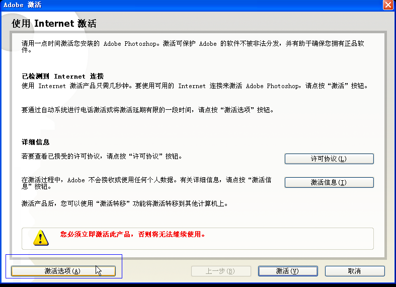 4、返回photoshop cs2激活界面,输入刚才生成的5组授权码,按“激活”,激活成功。
